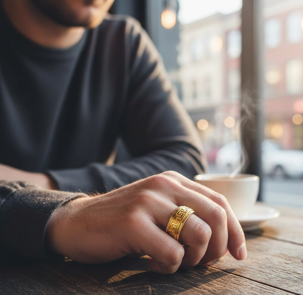 Dank seiner innovativen Rotationsfunktion dient er als idealer Anti-Stress-Ring, der durch sanftes Drehen hilft, Spannungen im Alltag abzubauen.