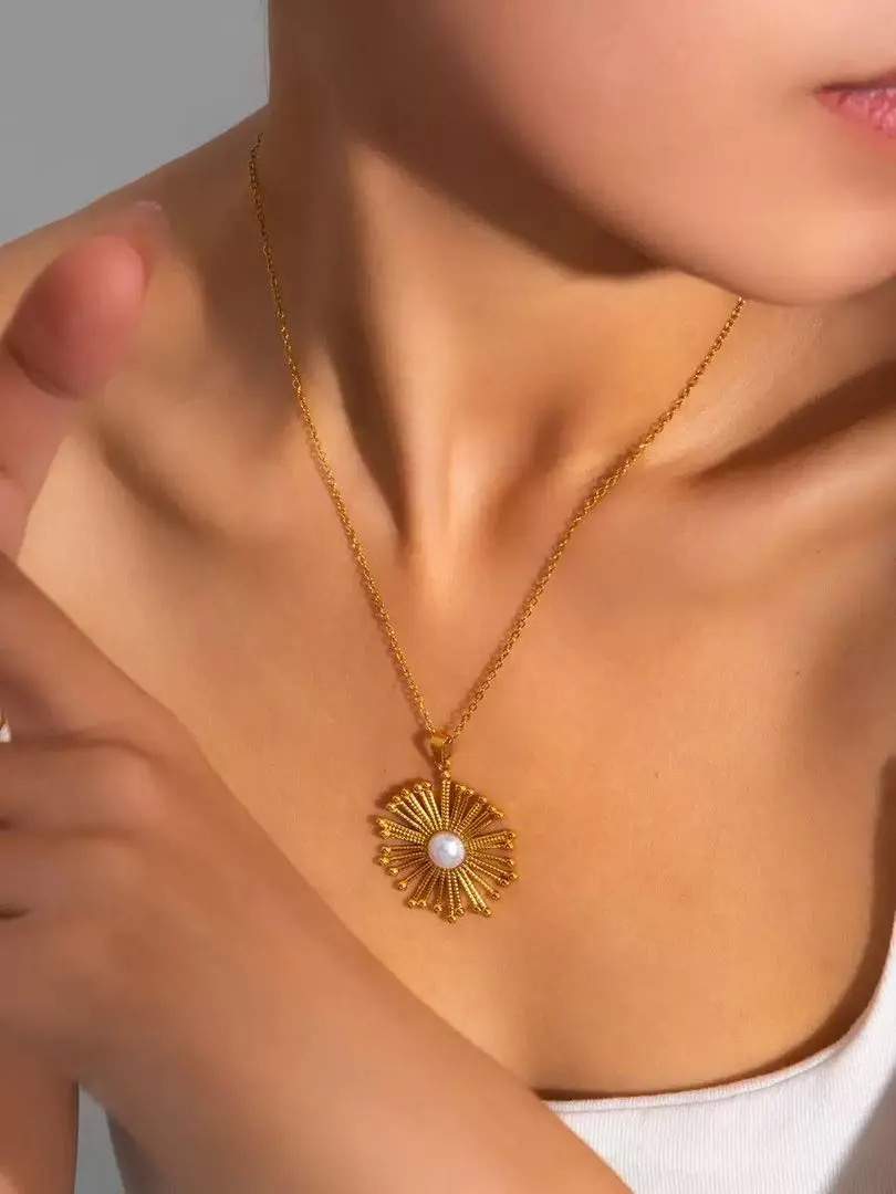 Sonnenstrahlen-Halskette mit Perlen-Zentrum – Gold